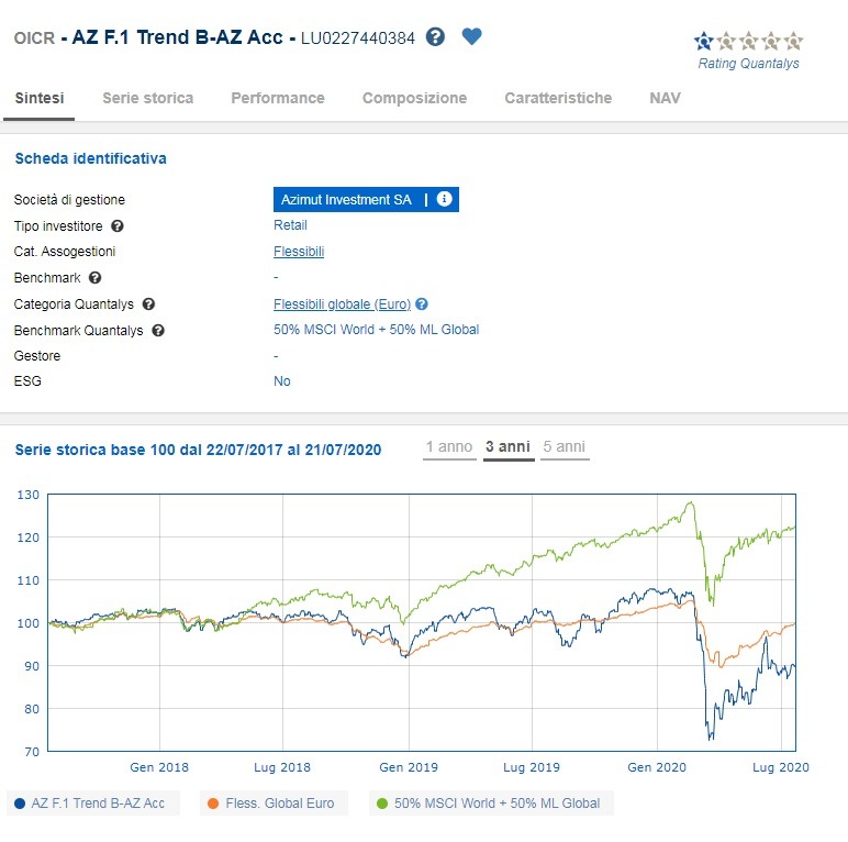 Negli ultimi 3 anni i risultati del fondo sono stati piuttosto deludenti, la performance a 3 anni è negativa di circa il 10% ed è perdente anche in confronto con la media dei fondi flessibili che hanno avuto un risultato mediamente del 10% superiore attestandosi in pareggio. Ma il distacco più evidente è verso un semplice mercato bilanciato che nello stesso periodo ha guadagnato il 20%.