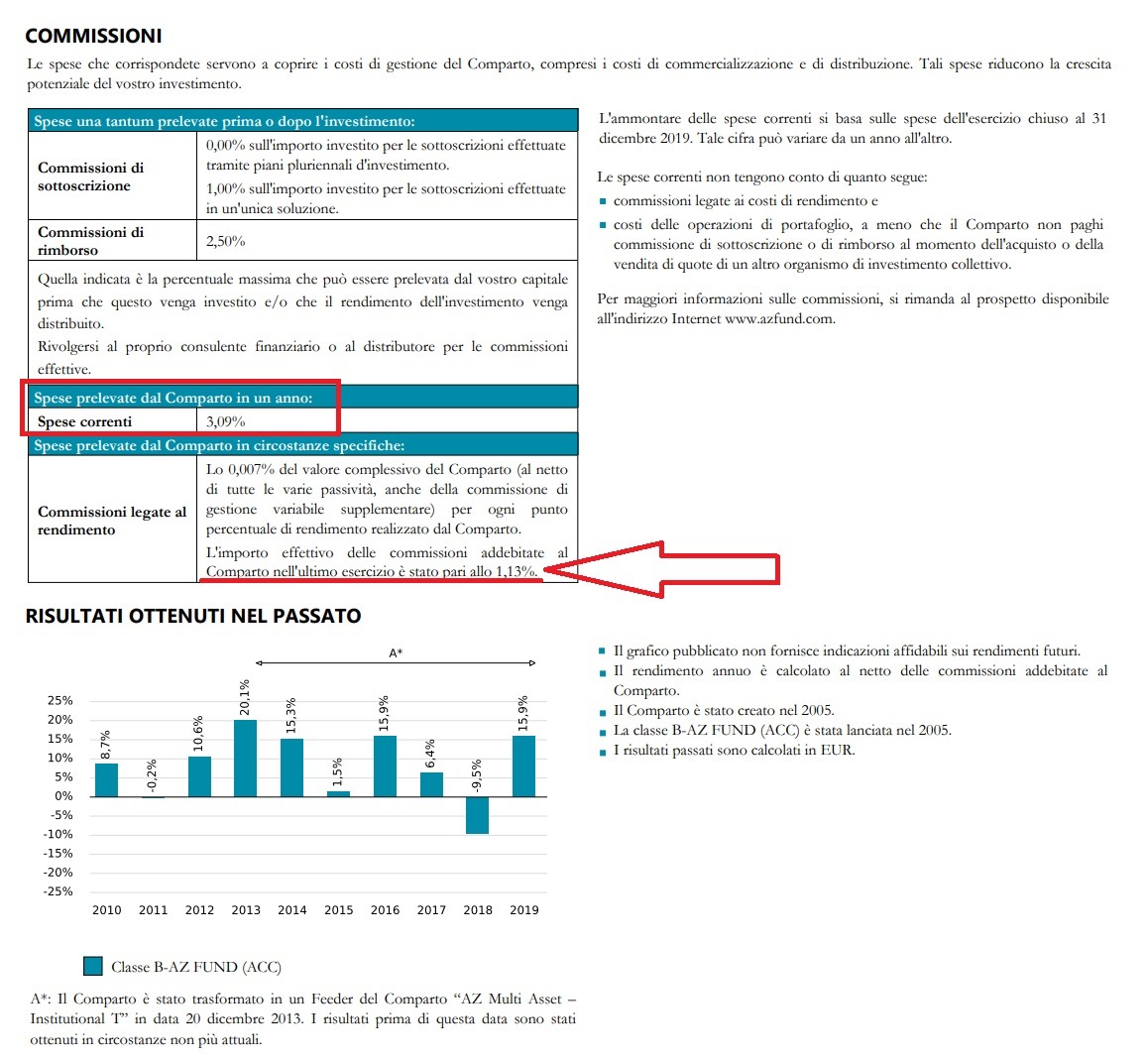 Come si può vedere dal KID emesso dalla società, nel corso dell’ultimo esercizio 2019 le commissioni complessive sono lievitate fino al 3,09% con un aggravio commissionale rispetto alle commissioni di gestione standard di un ulteriore 1,13%. Si tratta di oneri per il sottoscrittore estremamente elevati che come già detto dovrebbero essere generati da risultati decisamente sopra la media di categoria.