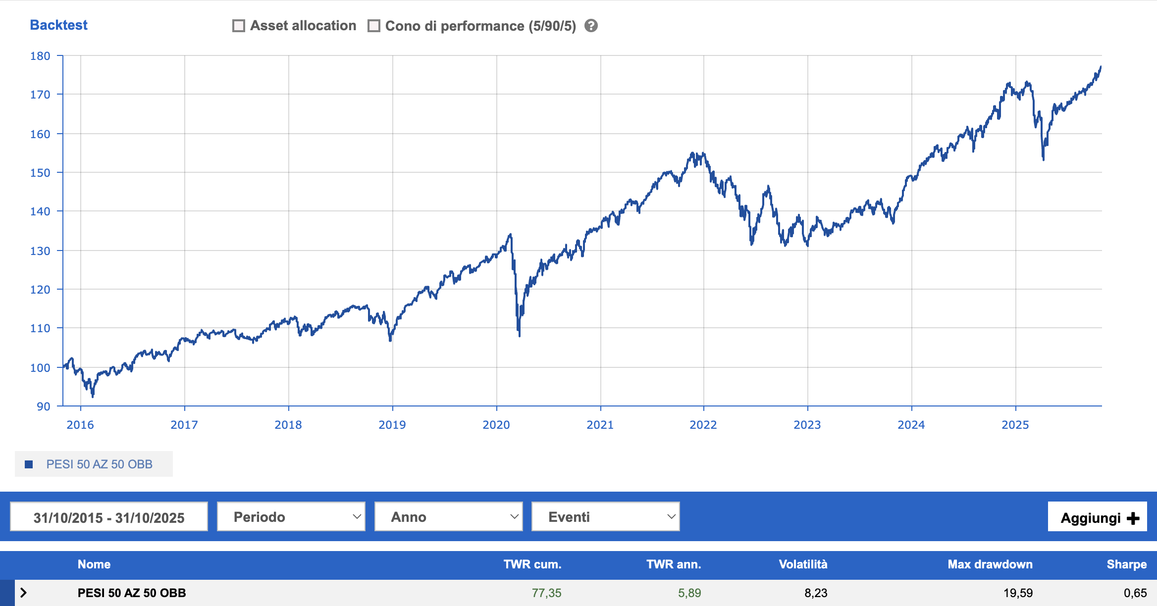 Rendimento 10 anni portafoglio bilanciato 50% azionario 50% obbligazionario, strategia buy & hold